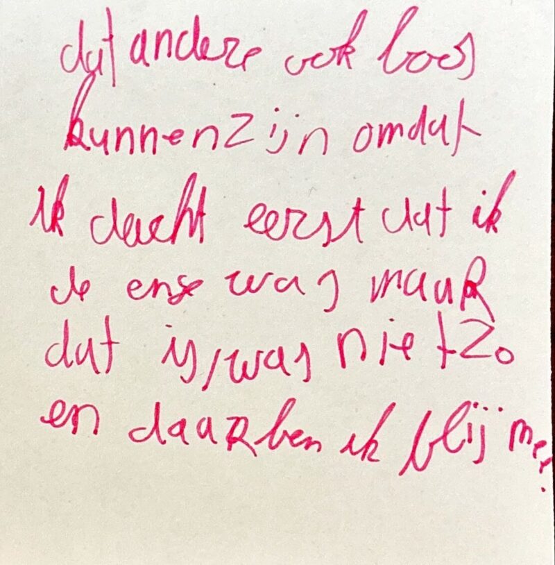 “Dat andere ook boos kunnen zijn omdat ik dacht eerst dat ik de enige was maar dat is/was niet zo en daar ben ik blij mee”