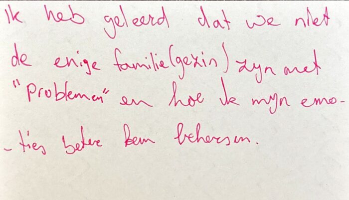 “Ik heb geleerd dat we niet de enige familie(gezin) zijn met ‘problemen’ en hoe ik mijn emoties beter kan beheersen!”