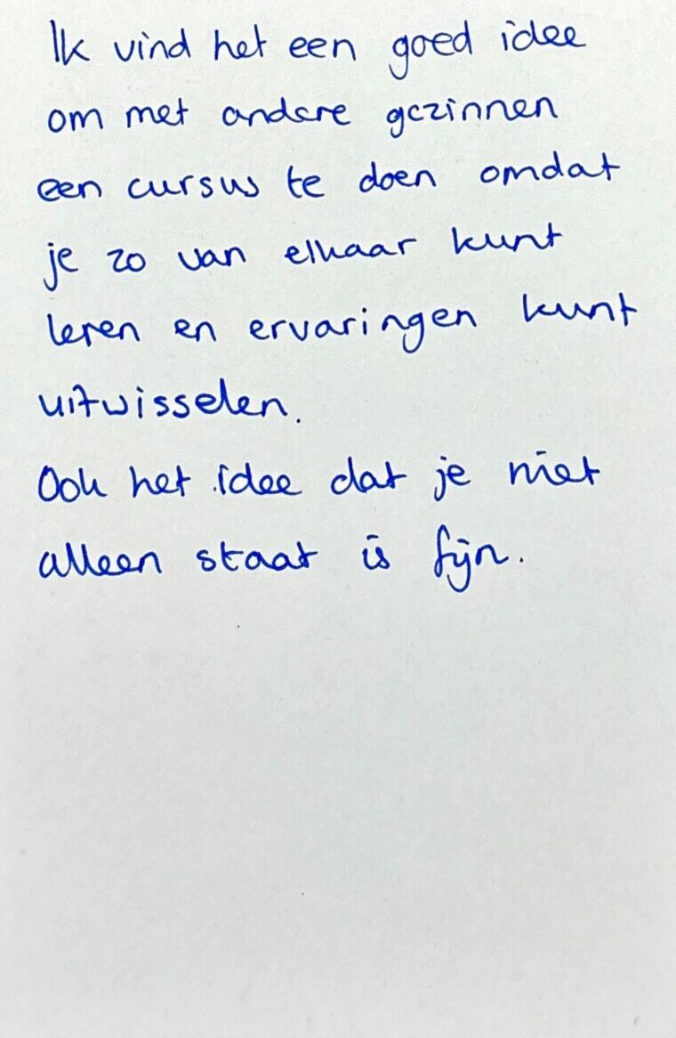 “Ik vind het een goed idee om met andere gezinnen een cursus te doen omdat je zo van elkaar kunt leren en ervaringen kunt uitwisselen. Ook het idee dat je niet alleen staat is fijn.”