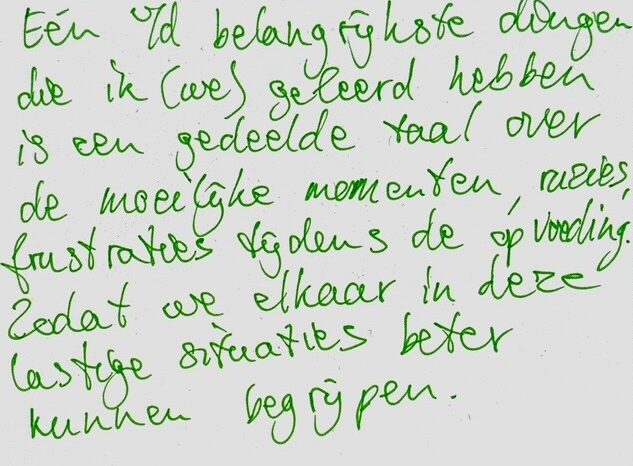 “Eén van de belangrijkste dingen die we geleerd hebben is een gedeelde taal over de moeilijke momenten, ruzies, frustraties tijdens de opvoeding. Zodat we elkaar in deze lastige situaties beter kunnen begrijpen.”